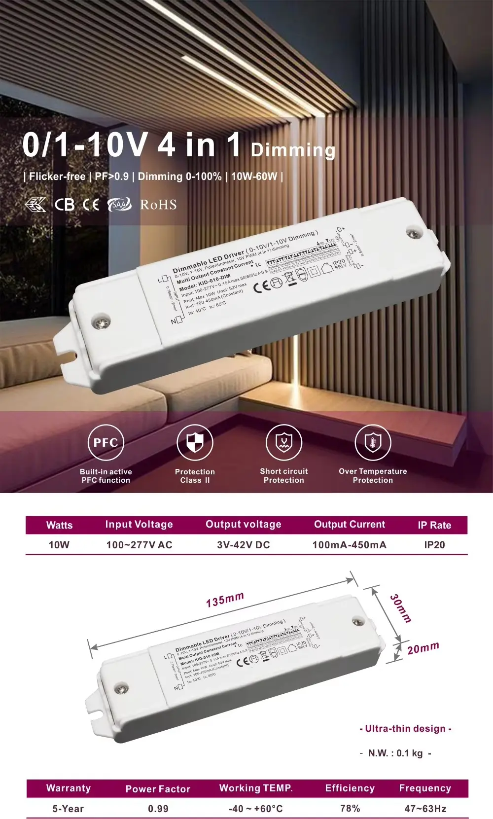 Spesifikasi Pemacu Led Boleh Dimalapkan Arus Starwell 0-10V: