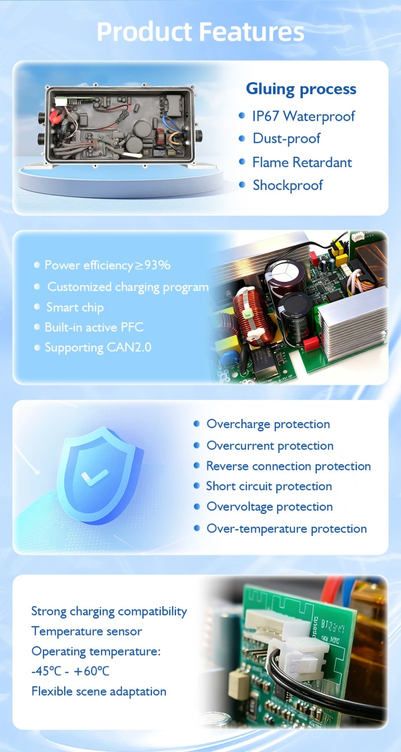 Cangkang aloi aluminium penuh meningkatkan kecekapan pelesapan haba sebanyak 35% berbanding cangkerang plastik, mengekalkan suhu operasi pengecas di bawah 60 ℃ semasa operasi berterusan 1.2kW, sekali gus melindungi komponen dalaman dan memanjangkan hayat perkhidmatan. Selain itu, ia dilengkapi dengan mekanisme perlindungan keselamatan berbilang lapisan, termasuk perlindungan lebihan voltan (maksimum 55V), perlindungan lebihan arus (maks 28A), perlindungan litar pintas dan perlindungan lebih suhu, dengan berkesan mencegah kerosakan pada pengecas dan bateri, dan memastikan operasi yang selamat dalam semua persekitaran on-board.