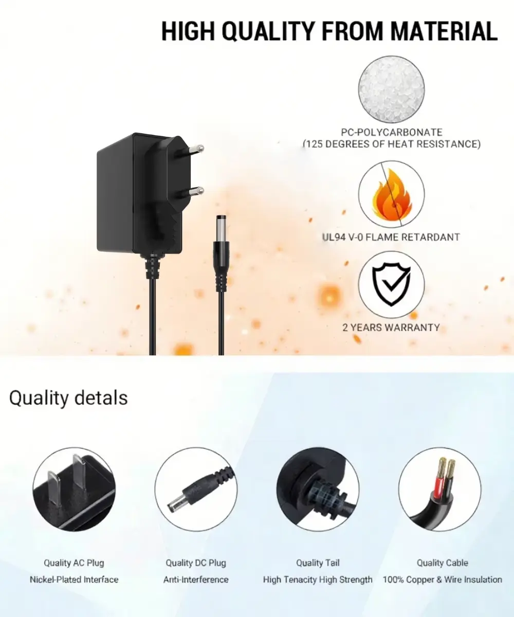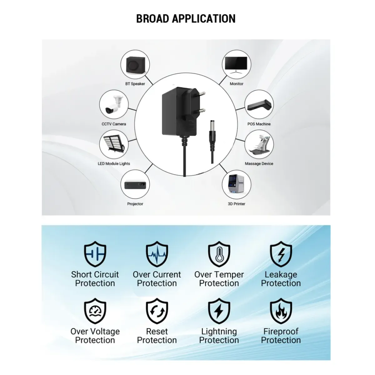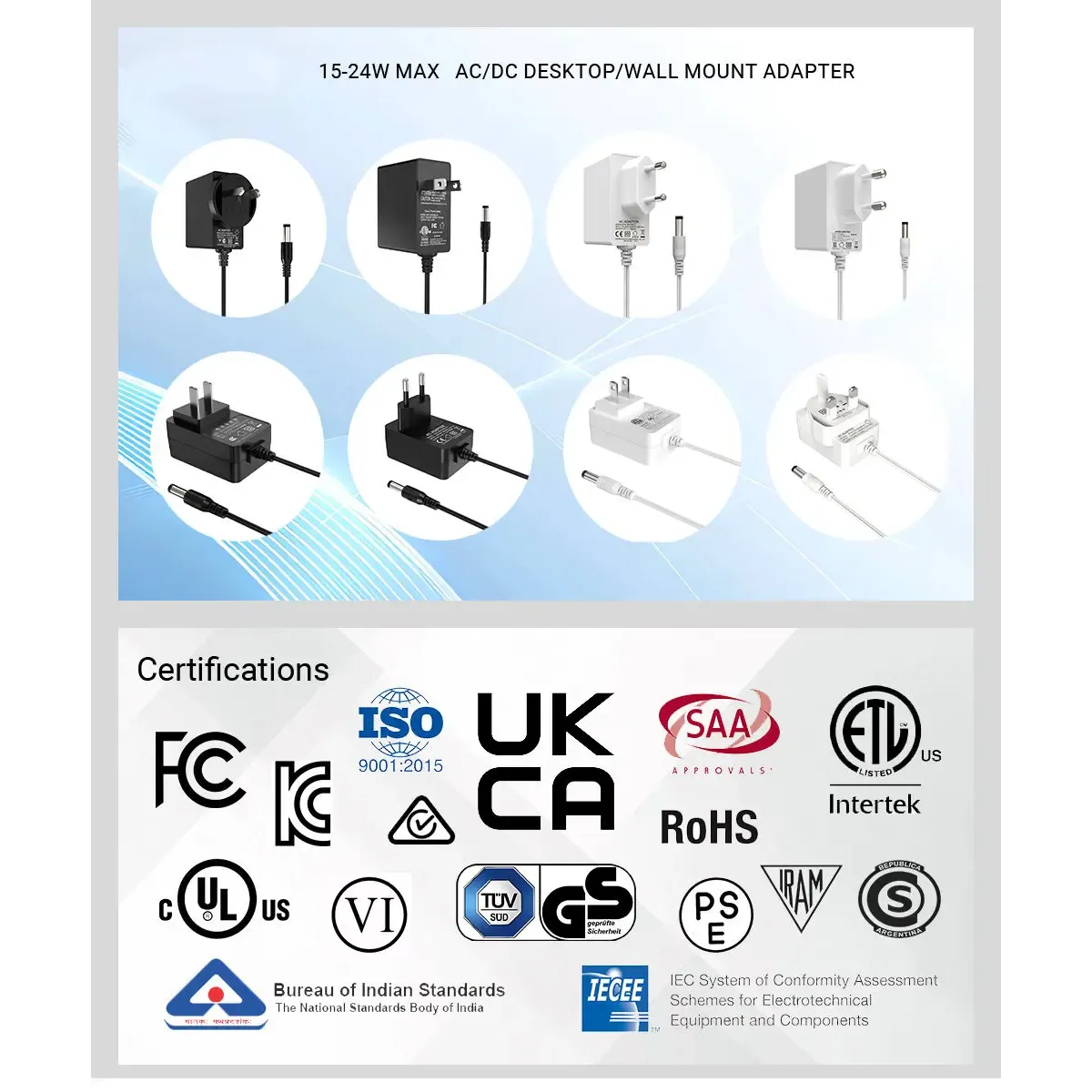 Siri Penyesuai Kuasa 24W memenuhi piawaian antarabangsa yang ketat dan menawarkan pensijilan global, termasuk sijil CE/FCC/UL/RCM/SAA/KC/BIS/PSE, memastikan pematuhan keselamatan dan alam sekitar. Reka bentuk plag Eropah membolehkan sambungan selamat, menjadikannya mudah digunakan dalam pelbagai tetapan.