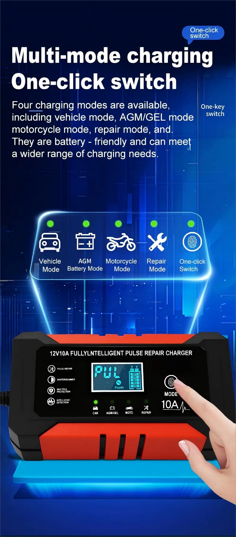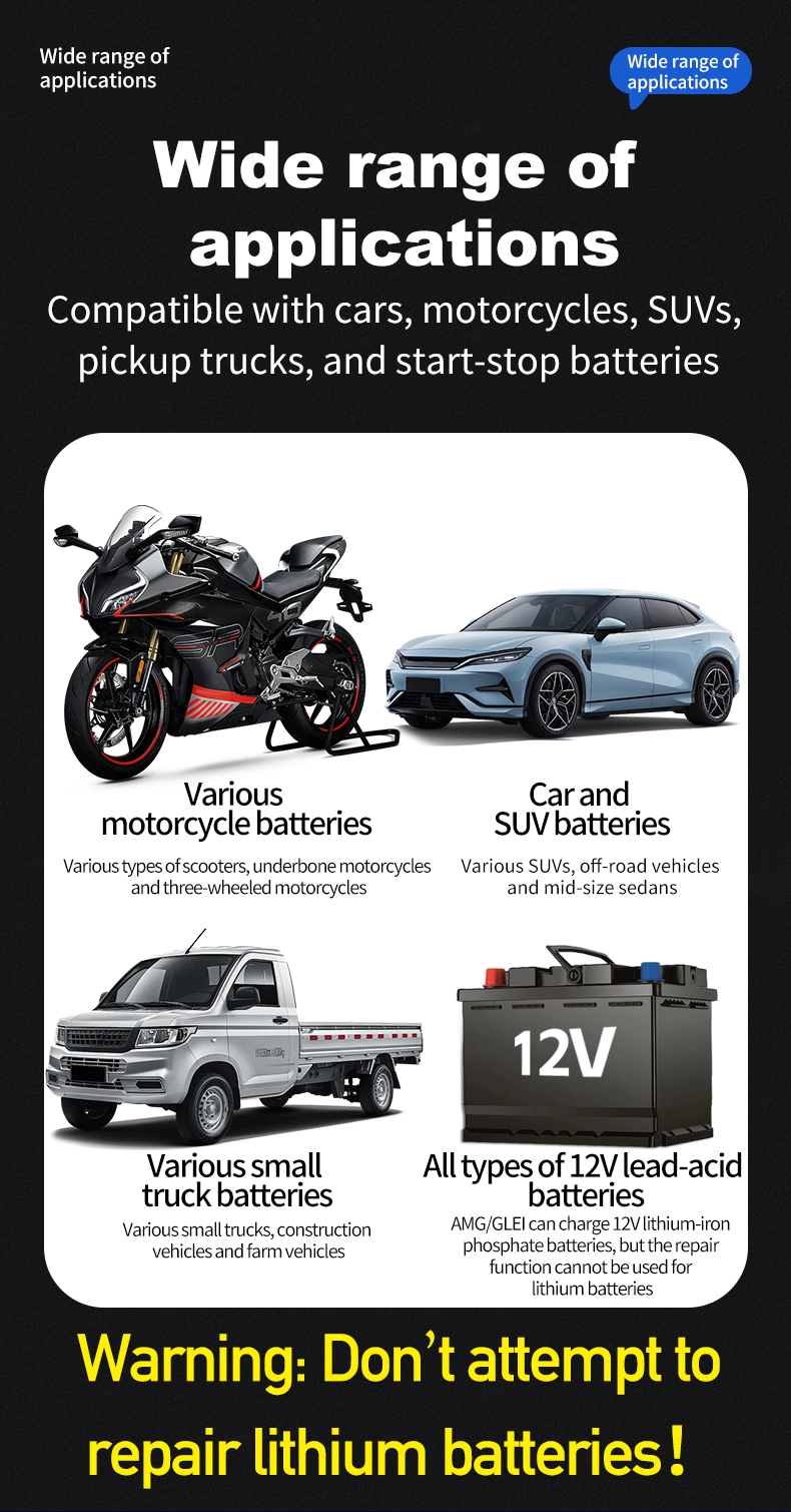 1. Keserasian Universal & Sokongan Berbilang Bateri: Ia berfungsi dengan lancar dengan semua jenis bateri 12V, termasuk asid plumbum, AGM, Gel dan LiFePO4, meliputi kapasiti bateri daripada 6Ah hingga 180Ah. Julat input lebar 110~230V menghapuskan had serantau, menjadikannya boleh digunakan di lebih 100 negara dan wilayah di seluruh dunia.