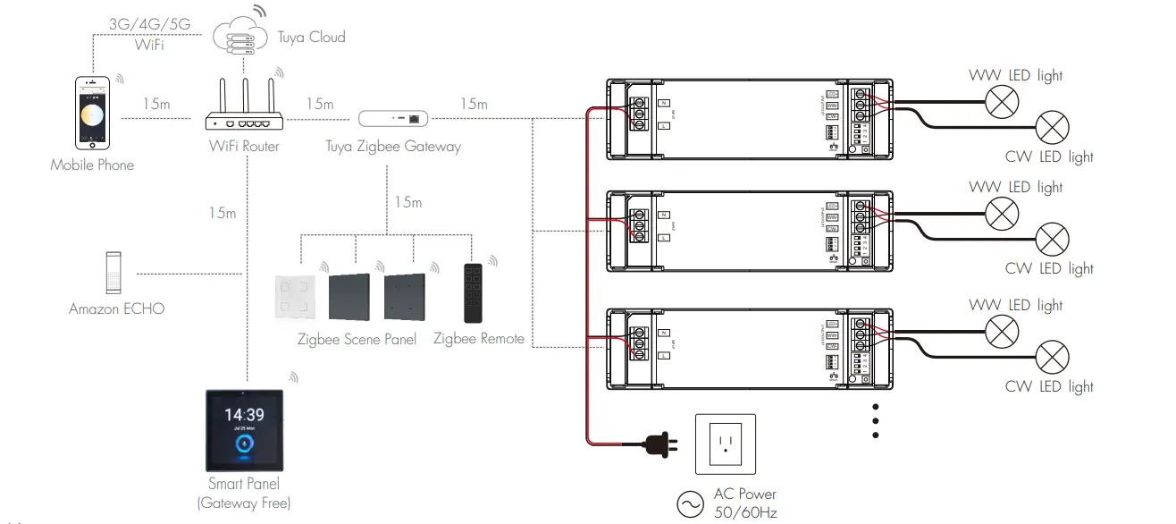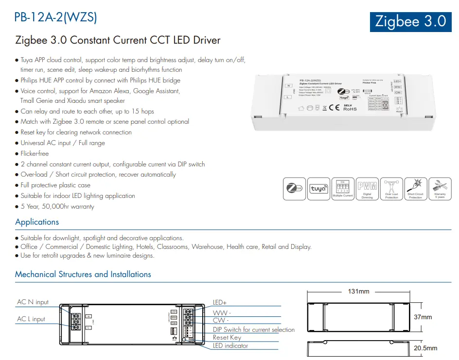Pemacu LED Zigbee TUYA menyokong sepenuhnya protokol TUYA Zigbee untuk sambungan wayarles yang stabil, mencapai CCT tanpa kerlipan licin dan peredupan kecerahan. Ia menyokong kawalan APP, kawalan suara, kawalan kumpulan dan mod pemandangan, membawa kemudahan besar kepada sistem pencahayaan pintar.