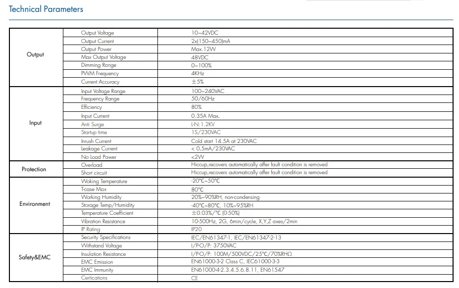 Dengan input universal 100~240VAC, Pemacu LED Boleh Malap CCT menyesuaikan diri dengan grid kuasa global. Kecekapan tinggi sehingga 85% dan faktor kuasa ≥0.90 penggunaan tenaga dan penjanaan haba yang lebih rendah, memanjangkan jangka hayat pemandu dan LED.