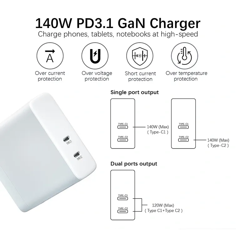 Dua port jenis-C: menyokong protokol arus perdana seperti PD3.1 dan QC4+. Starwell 140W PD 3.1 GAN Charger boleh mengenakan telefon bimbit, komputer riba, tablet, dan menukar semua dalam satu, menghapuskan keperluan untuk beberapa pengecas dan mengurangkan kekacauan.