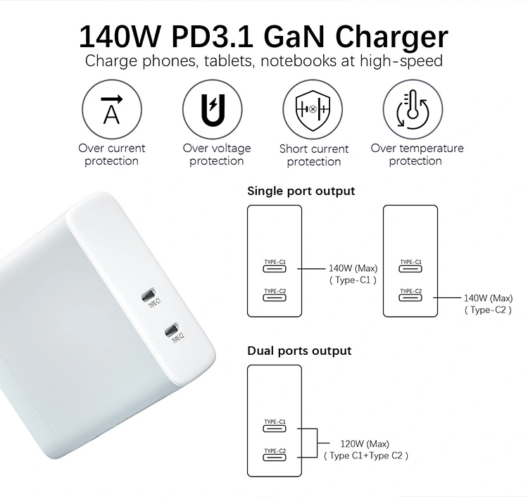 140W Dual USB C Port PD Charger US Pluge Foldable: Port tunggal boleh menyediakan sehingga 140W kuasa. Kuasa output port dua secara bijak diperuntukkan serentak. Apabila mengecas komputer riba dan telefon bimbit pada masa yang sama, kecekapan tetap tidak berubah.