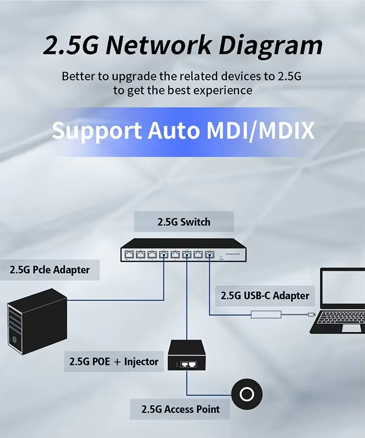 Kekal di hadapan keluk lebar jalur dengan sokongan untuk kelajuan data 2.5Gbps, serasi ke belakang sepenuhnya dengan peranti 10/100/1000Mbps.