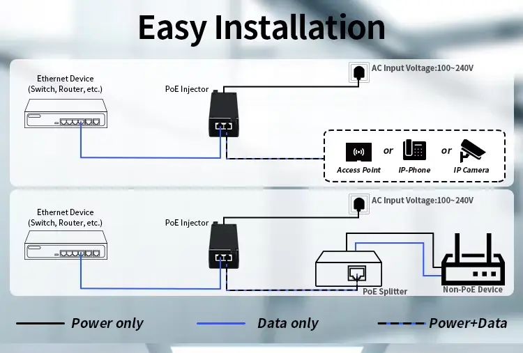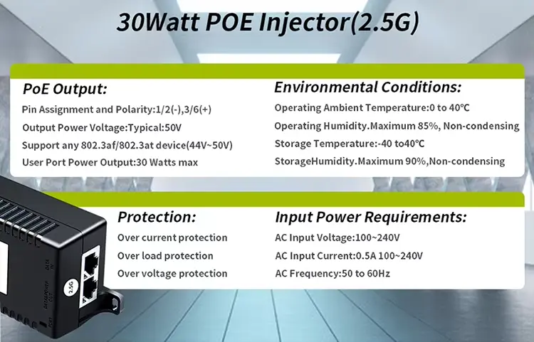 Penyuntik Poe 30W ini menyokong pelbagai piawaian PoE, menjadikannya pilihan yang fleksibel untuk pelbagai peranti.