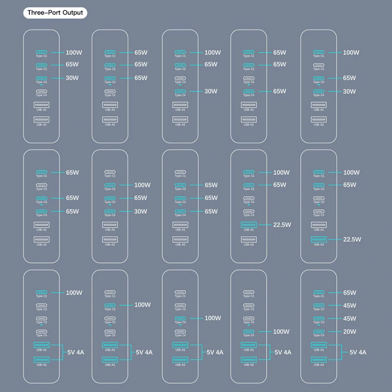 Output USB C1/C2/C3/C4: 5V/3A 9V/3A 12V/3A 15V/3A 20V/5A (100W MAX) USB A1/A2: 5V/3A 9V/2A 12V/1.5A (18W max) |