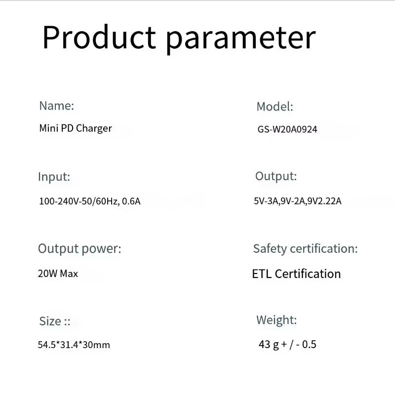 Spesifikasi pengecas PD Plug Versi 20W Jepun: |