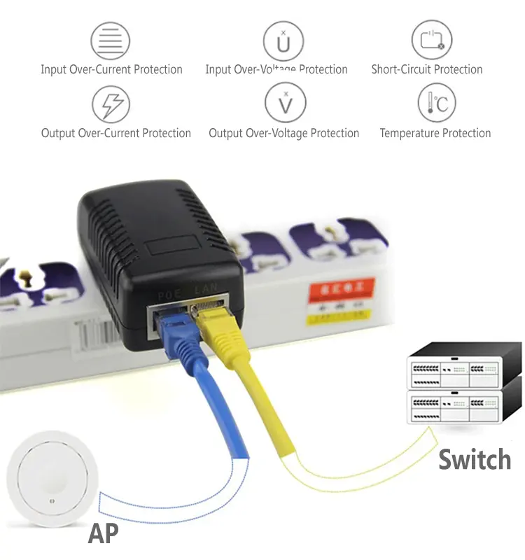 Penyuntik POE 2 Port menyalurkan voltan dan arus yang stabil dengan riak rendah, memastikan operasi stabil jangka panjang. Voltan input lebar 100–240VAC menyesuaikan diri dengan grid kuasa global. Perlindungan voltan lebih, arus lebih, litar pintas dan suhu lebih terbina dalam melindungi kedua-dua penyuntik POE dwi port dan peralatan yang disambungkan.