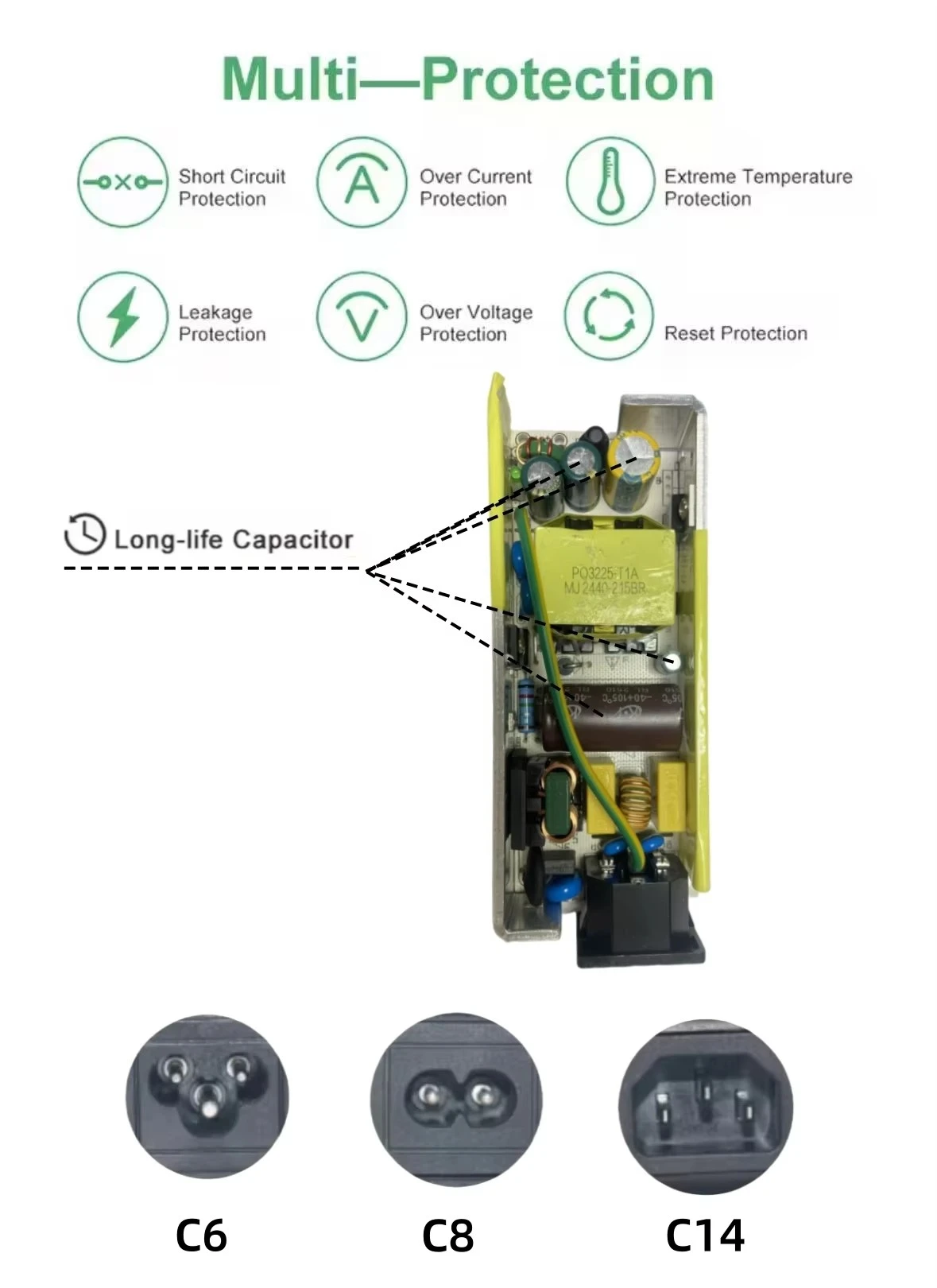 Perlindungan Keselamatan Komprehensif: Perlindungan bersepadu termasuk Perlindungan Arus Lebih (OCP), Perlindungan Voltan Lebih (OVP) dan Perlindungan Litar Pintas (SCP) menghalang kerosakan pada penyesuai dan peralatan berharga anda.