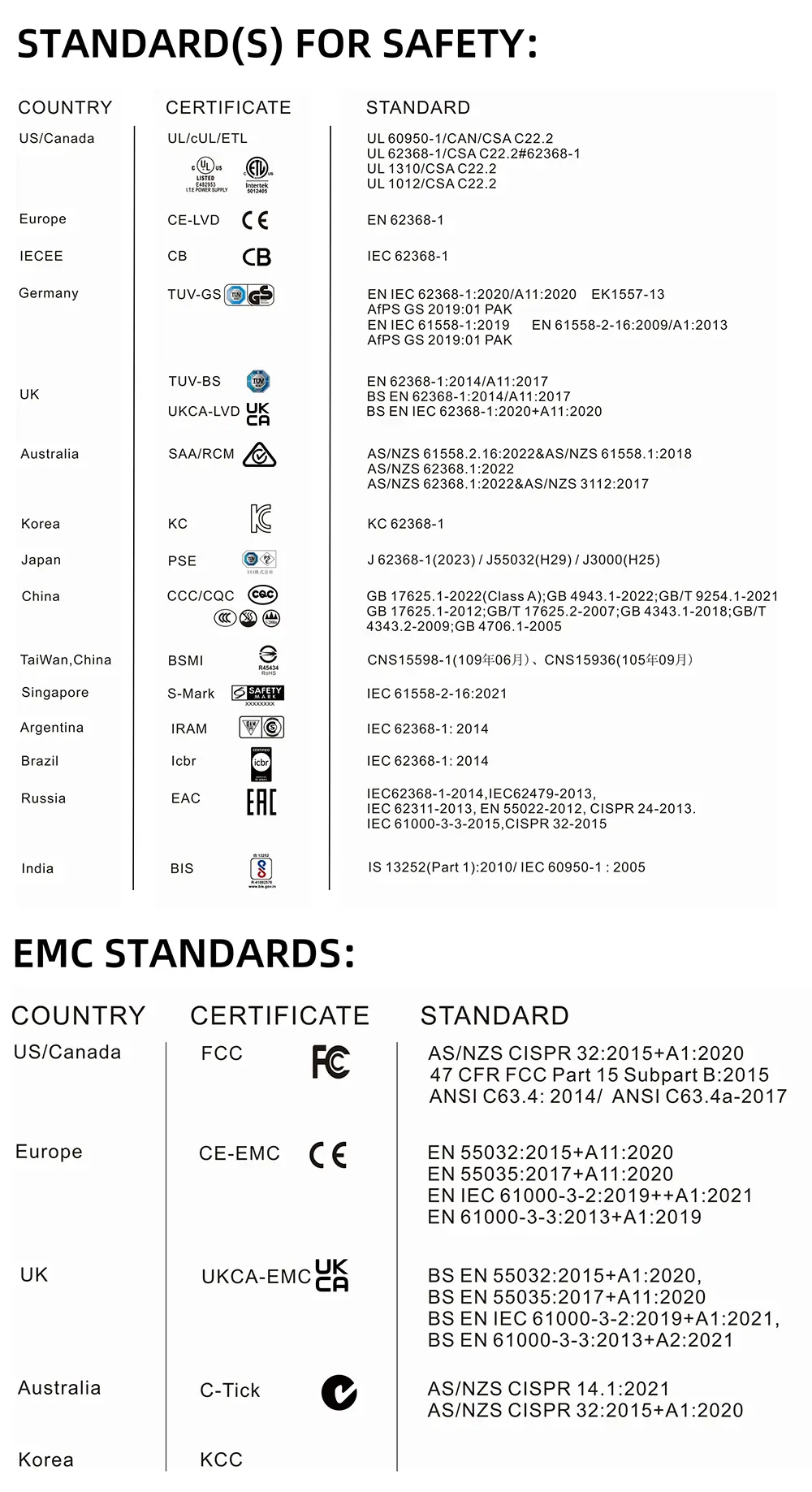 Keselamatan anda adalah yang utama. Penyesuai ini direka bentuk dan dihasilkan untuk memenuhi piawaian antarabangsa yang ketat, memastikan bukan sahaja prestasi yang boleh dipercayai tetapi juga ketenangan fikiran. Ia mematuhi ETL CE FCC TUV GS CB PSE KC KCC BIS SAA RCM c-Tick CCC UKCA UL cUL RoHS , yang mengawal keselamatan, kesihatan dan perlindungan alam sekitar.