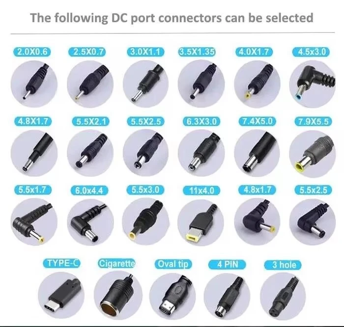 12V12A, 12V13A, 12V13.5A, 12.6V12A, 12.6V12.8A, 15V10A, 15V10.5A, 16.8V9.5A, 16.8V9.64, 18V10A, 19V9A, 19V9.47A, 20V9A, 20V8.5A, 21V8.5A, 21V8.57A, 24V7A, 24V7.5A, 25V7A, 25V7.2A, 25.2V7A, 25.2V7.14A, 29.4V6A, 29.4V6.12A, 30V6A, 33.6V5.35A, 33.6V5A, 42V4A, 42V4.28A |