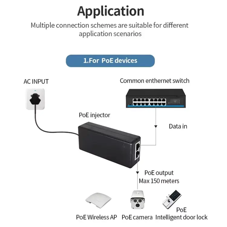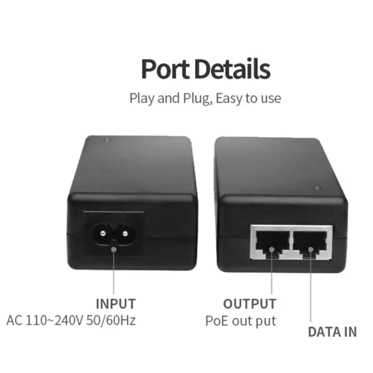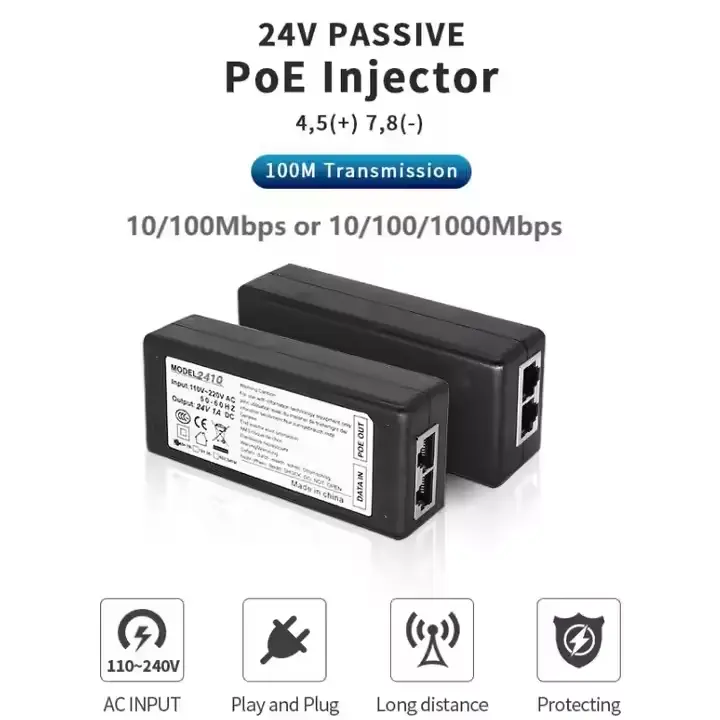 Penyuntik PoE pasif ini menggunakan penghantaran kuasa terus tanpa jabat tangan protokol, mengurangkan kerumitan sistem dan meningkatkan keserasian dengan peralatan rangkaian tertentu.