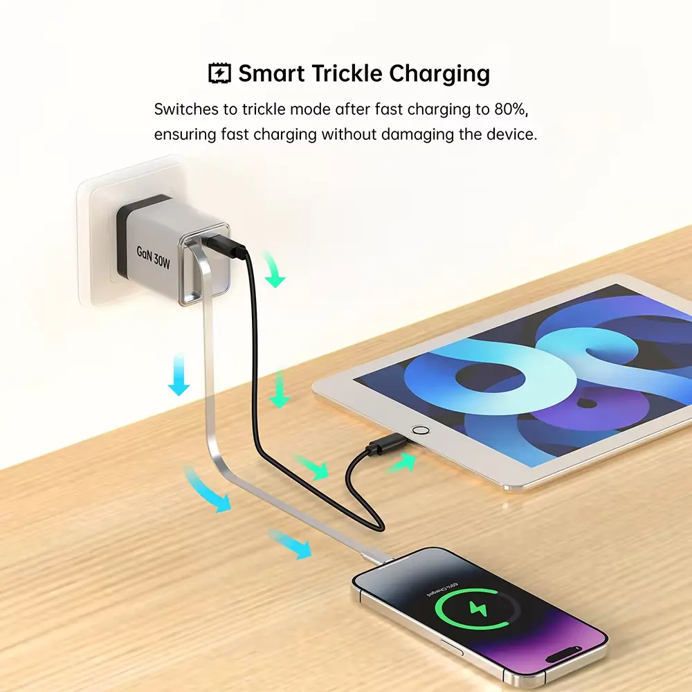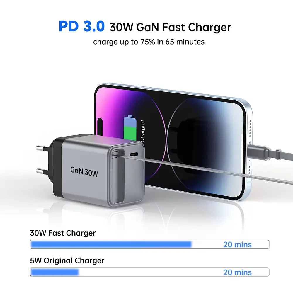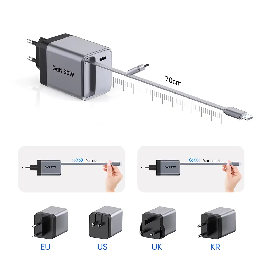 30W Pengecas cepat dengan reka bentuk ultra-ringan Cable yang ditarik balik, reka bentuk bersaiz saku menjadikannya mudah dibawa. Ia adalah pilihan yang sempurna untuk rumah, pejabat, atau perjalanan.