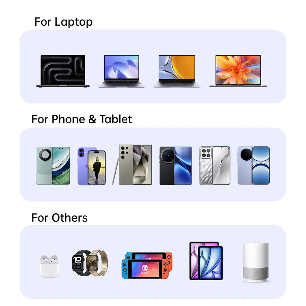 Sesuai dengan peranti USB-C, termasuk telefon bimbit, fon kepala, dan aksesori permainan. Secara automatik mengesan keperluan peranti untuk pengecasan yang selamat dan cekap. 4. Travel-siap mudah alih