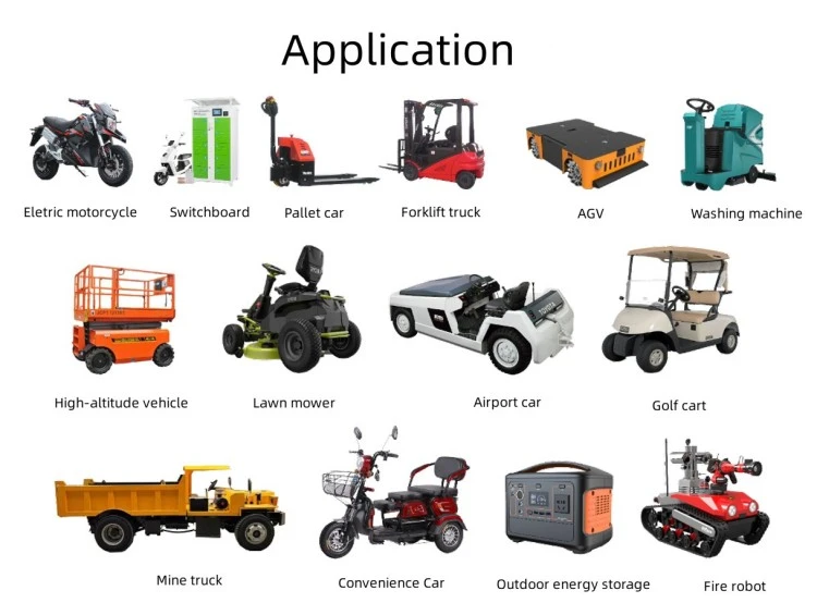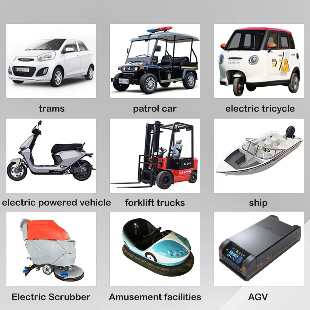 Aplikasi Produk Kereta bampar elektrik dan tunggangan hiburan Kenderaan persiaran dan kereta golf Kenderaan peronda dan kereta keselamatan Forklift dan peralatan pengendalian bahan Penggosok lantai dan mesin pencuci Kenderaan berpandu automatik (AGV) untuk gudang Kapal elektrik, bot, dan kapal utiliti marin