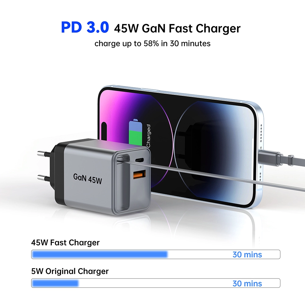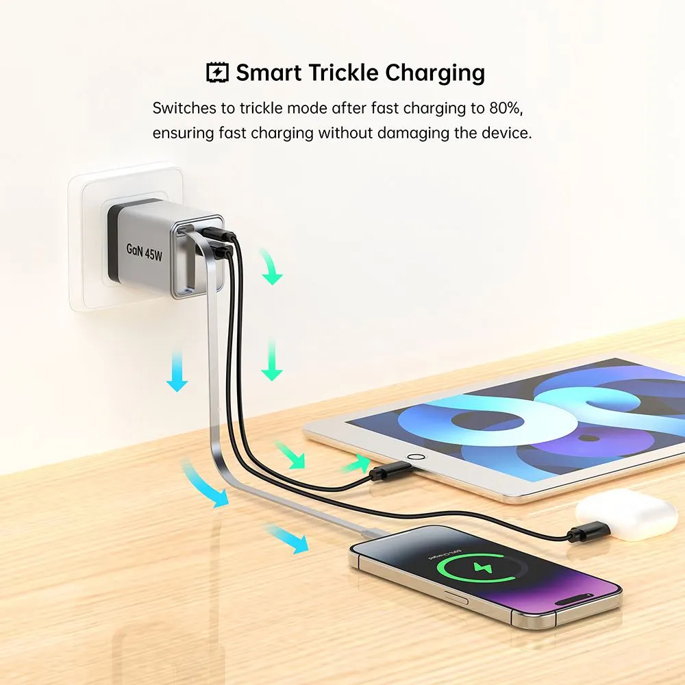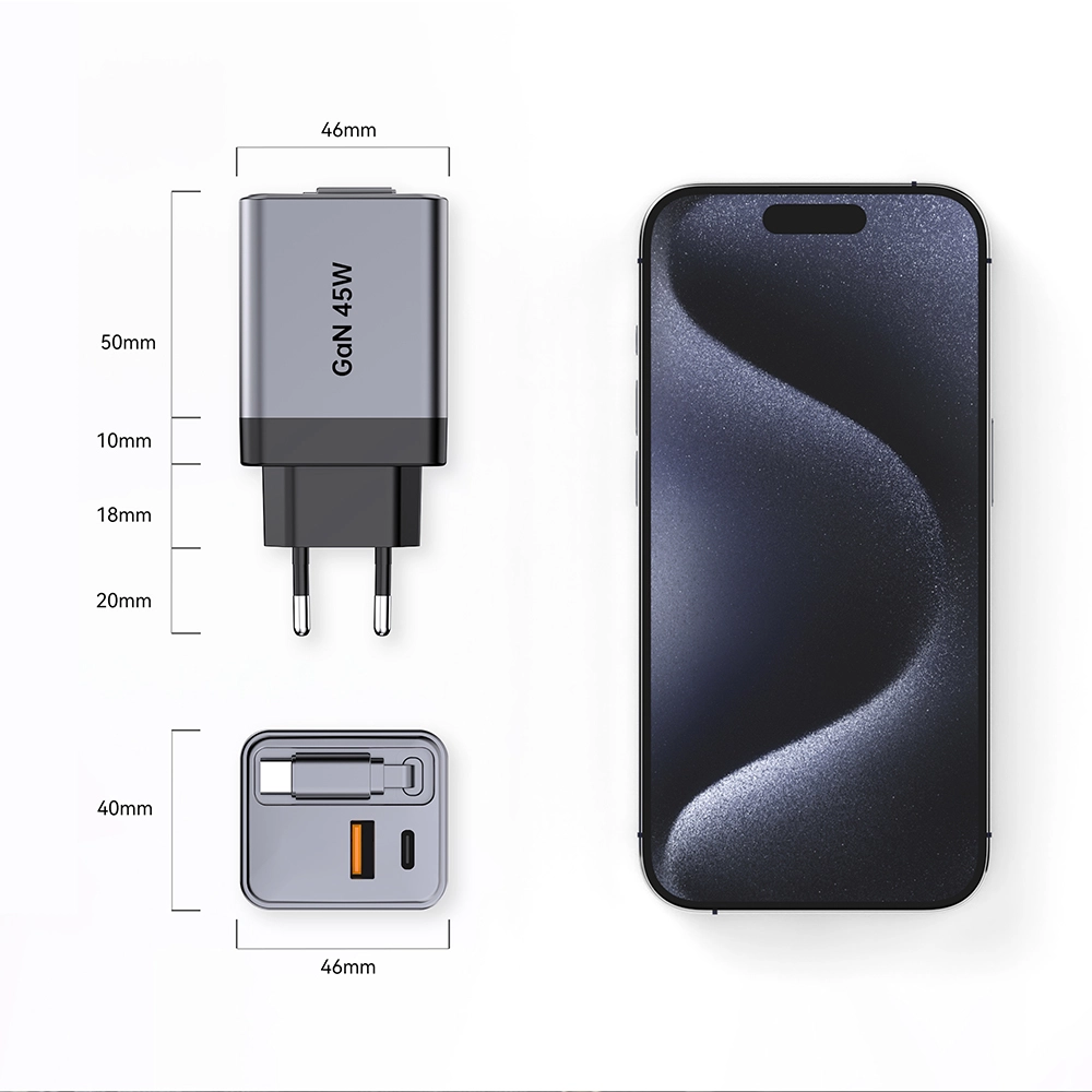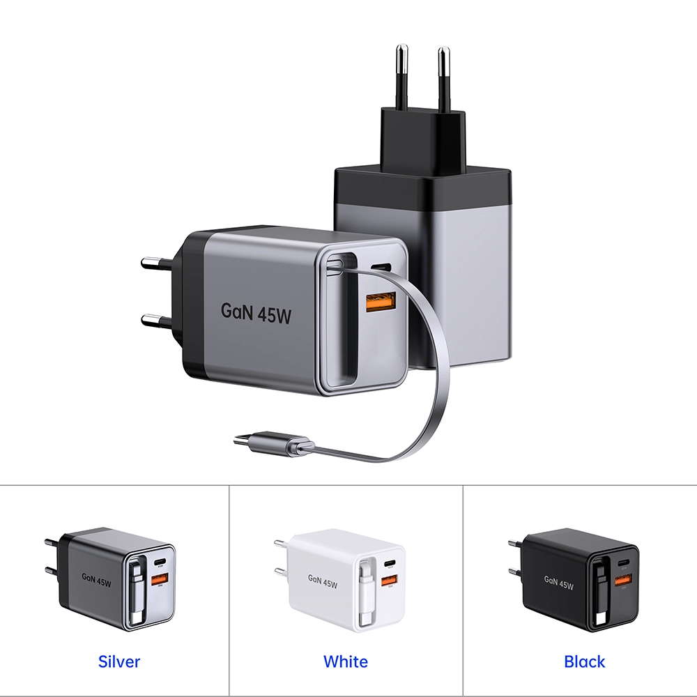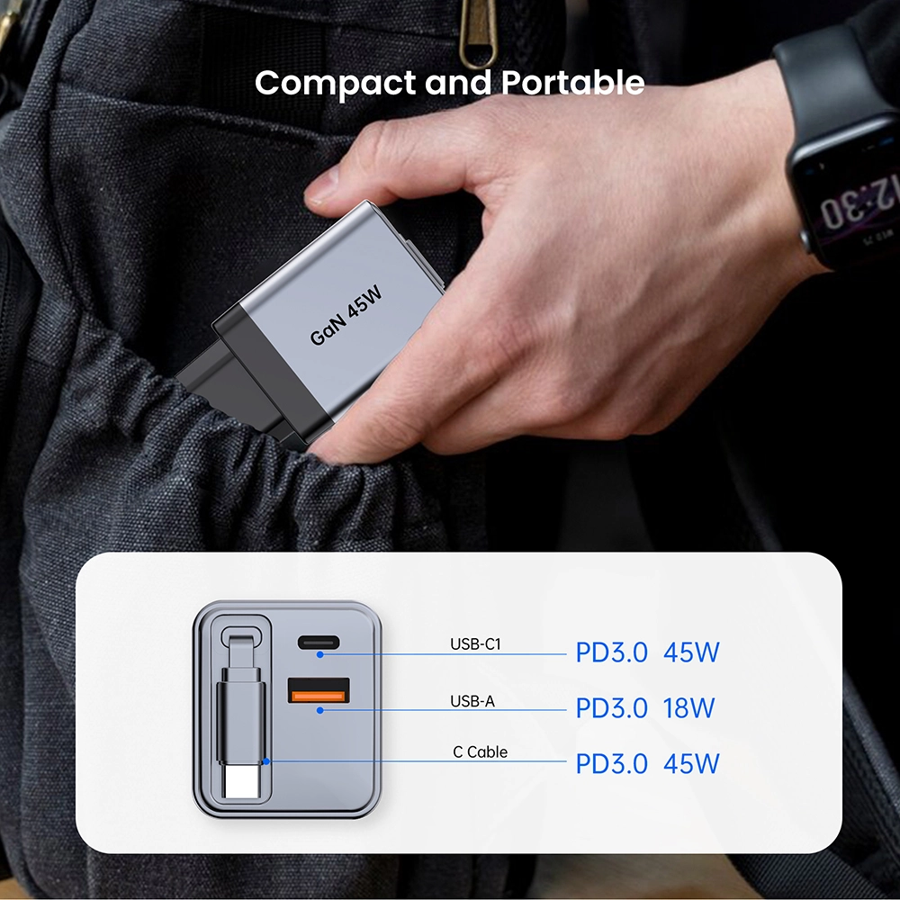 GAN 45W ditarik balik pengecas cepat USB-cable+USB-A+USB-C 45W PD Charger dengan kabel