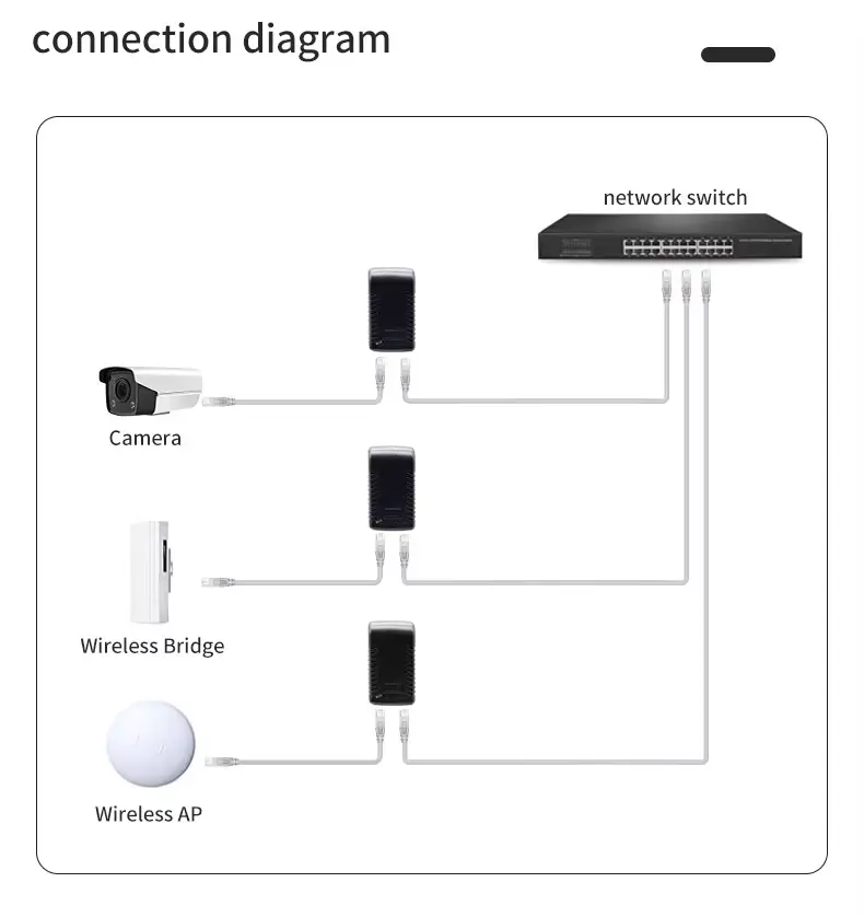 Penyuntik ini direka khusus untuk peranti rangkaian yang memerlukan input DC 48V melalui Ethernet. Ia serasi secara meluas dengan peralatan standard industri, termasuk: