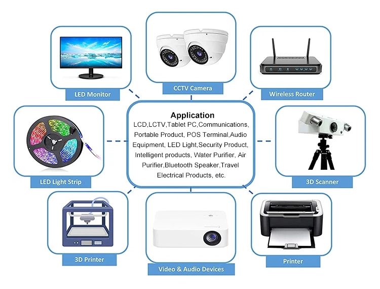 * Lebih banyak unit untuk siri 48W: 5V/9V/12V/15V/19V/24V/36V/48V tersedia * Keselamatan: OCP/OVP/OTP, SCP, pemotongan beban lampau automatik, pemotongan voltan lebih, pemotongan terma automatik. * Keserasian luas: Lampu Jalur LED, Pencetak 3D, transceiver radio ham, kamera CCTV, amp subwufer kereta, penguat audio, penghala wayarles, Kucing ADSL, Pelembap, HUB, Papan Kekunci, Pembesar Suara BT, Monitor, Kamera Web, DVR, NVR, bekalan kuasa audio/video