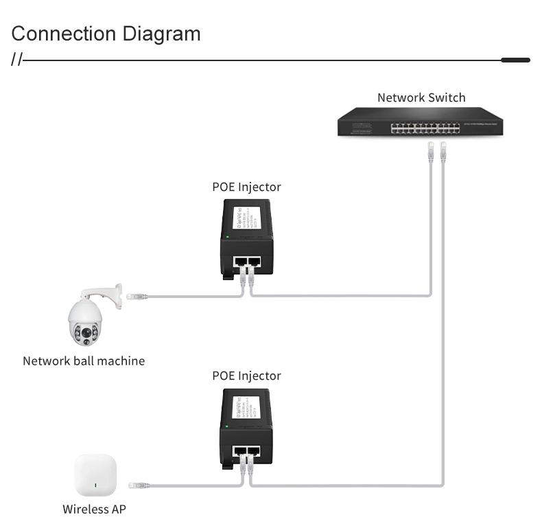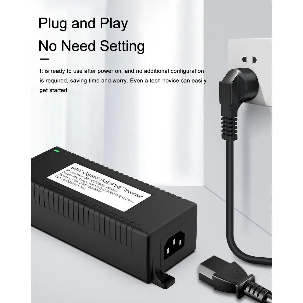 Pengawasan Keselamatan: Penyuntik POE desktop Gigabit 60W untuk Keselamatan Kamera IP dan Peranti Rangkaian menyediakan kuasa yang stabil kepada kamera IP dan kamera PTZ.