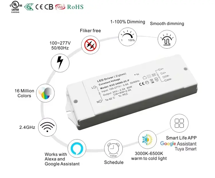 Pemasangan Mudah, Prestasi Berkekalan Direka untuk kesederhanaan, Pemacu 60W yang diketuai Zigbee 3.0 menampilkan sambungan pendawaian yang mudah dan selamat. Dengan penarafan IP20, ia sesuai untuk lokasi kering dan lembap-di dalam atau persekitaran yang dilindungi. Disokong oleh jaminan 5 tahun, ia menawarkan ketenangan fikiran jangka panjang.