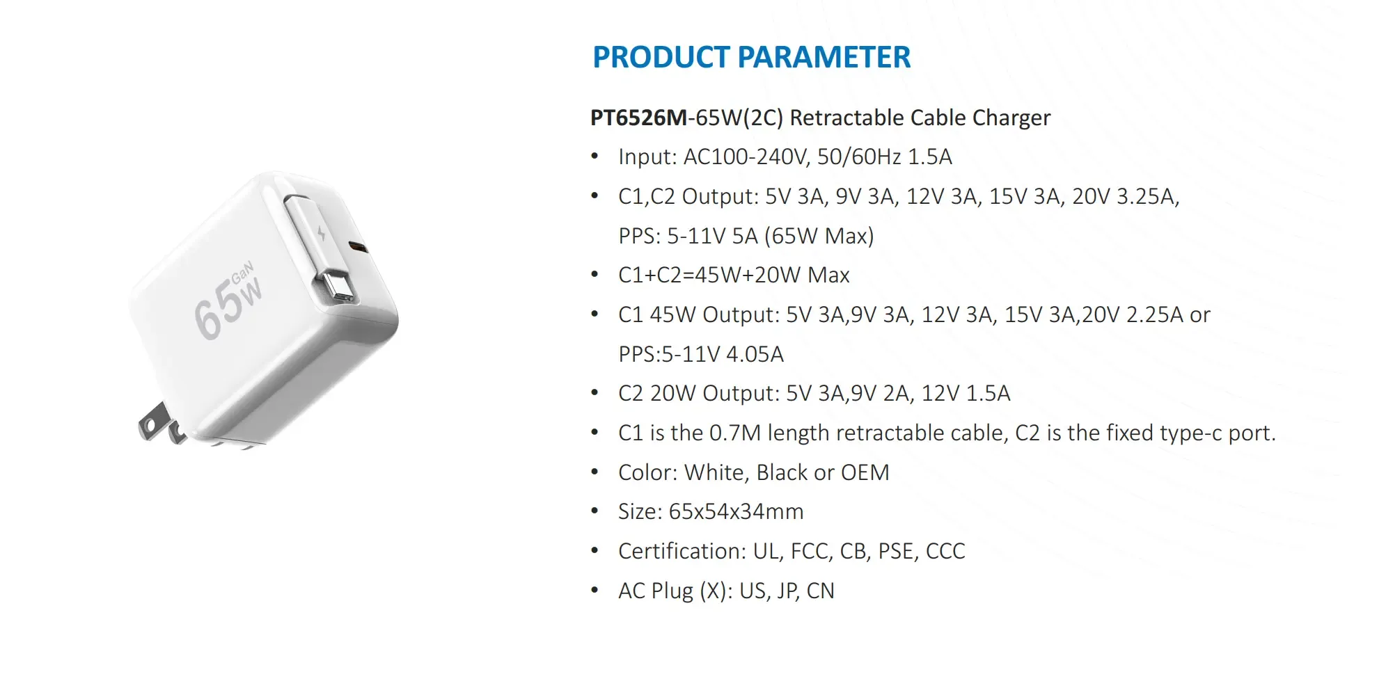 Pengecas PD 65W dengan spesifikasi kabel USB C yang boleh dikesan: