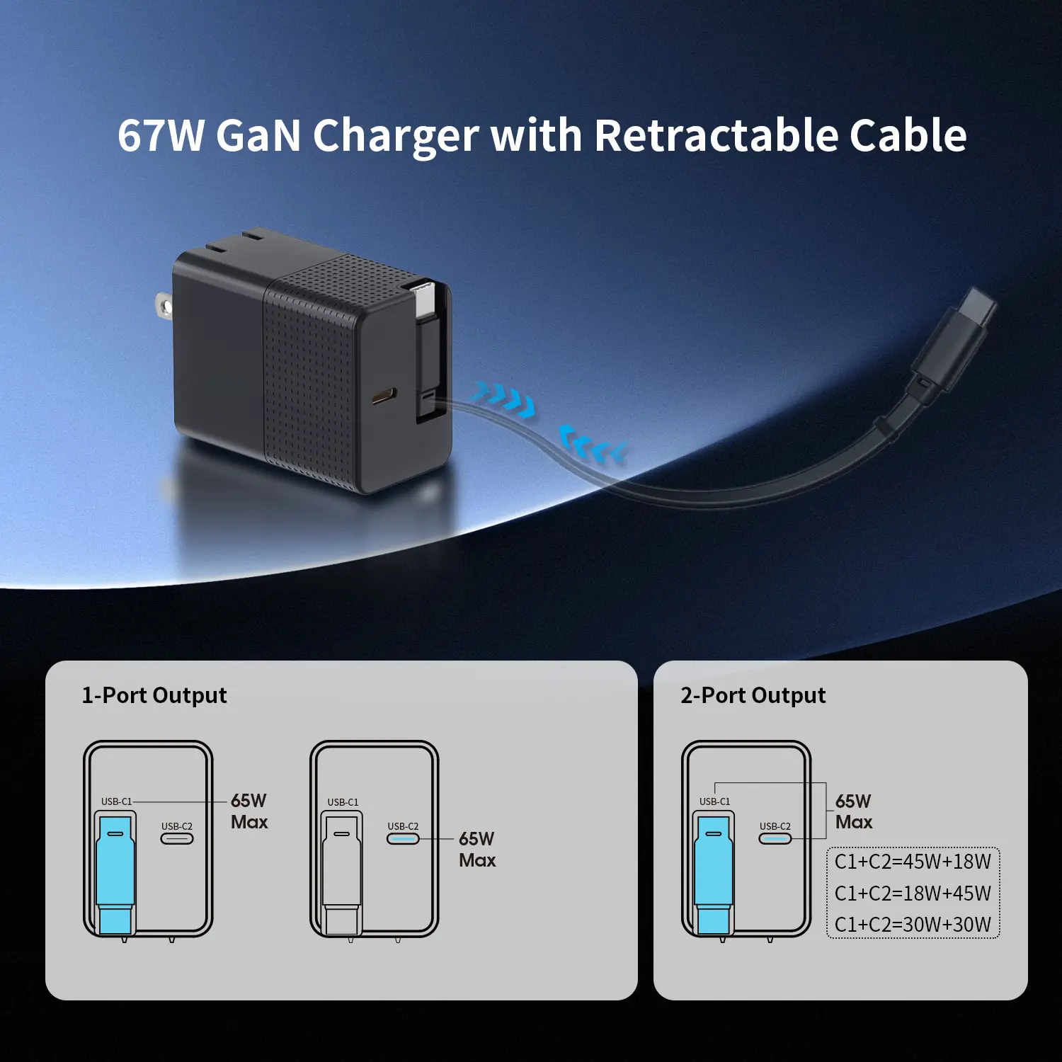 Dilengkapi dengan kabel yang boleh ditarik balik: Penyesuai pengecasan cepat 65W dilengkapi dengan kabel data USB-C yang mudah dan tidak beralun 2.3 kaki (1 meter). Kabel ini boleh lancar dan menarik balik, dengan itu mengelakkan kekacauan kabel kusut dan memastikan bahawa anda boleh mengenakan bayaran pada bila -bila masa.