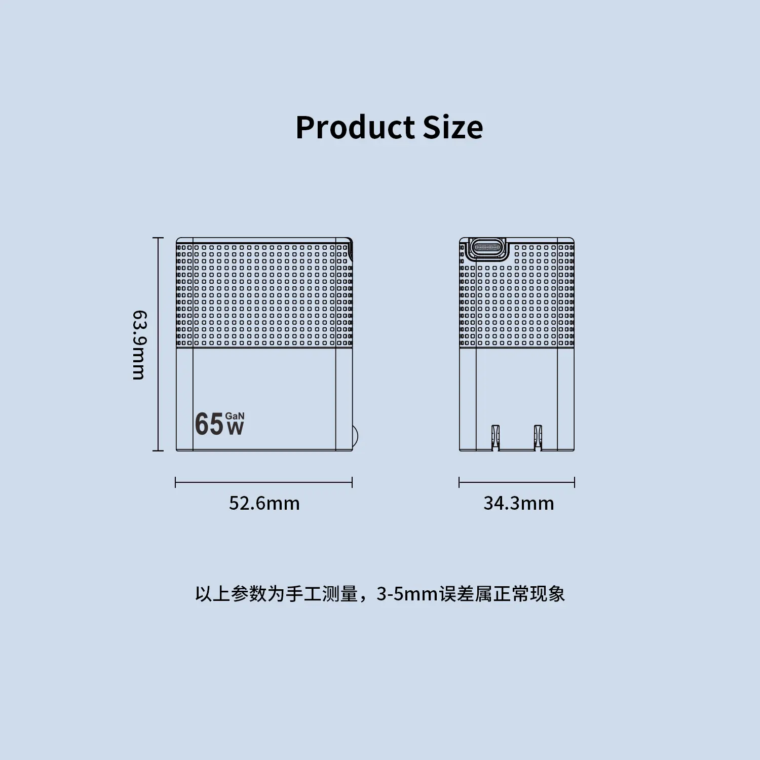 Dual USB-C Ports: Pengecas 65W PD 3.0 boleh mengenakan dua peranti secara serentak. Semasa dua proses pengecasan, kuasa diperuntukkan sebagai 45W dan 20W.