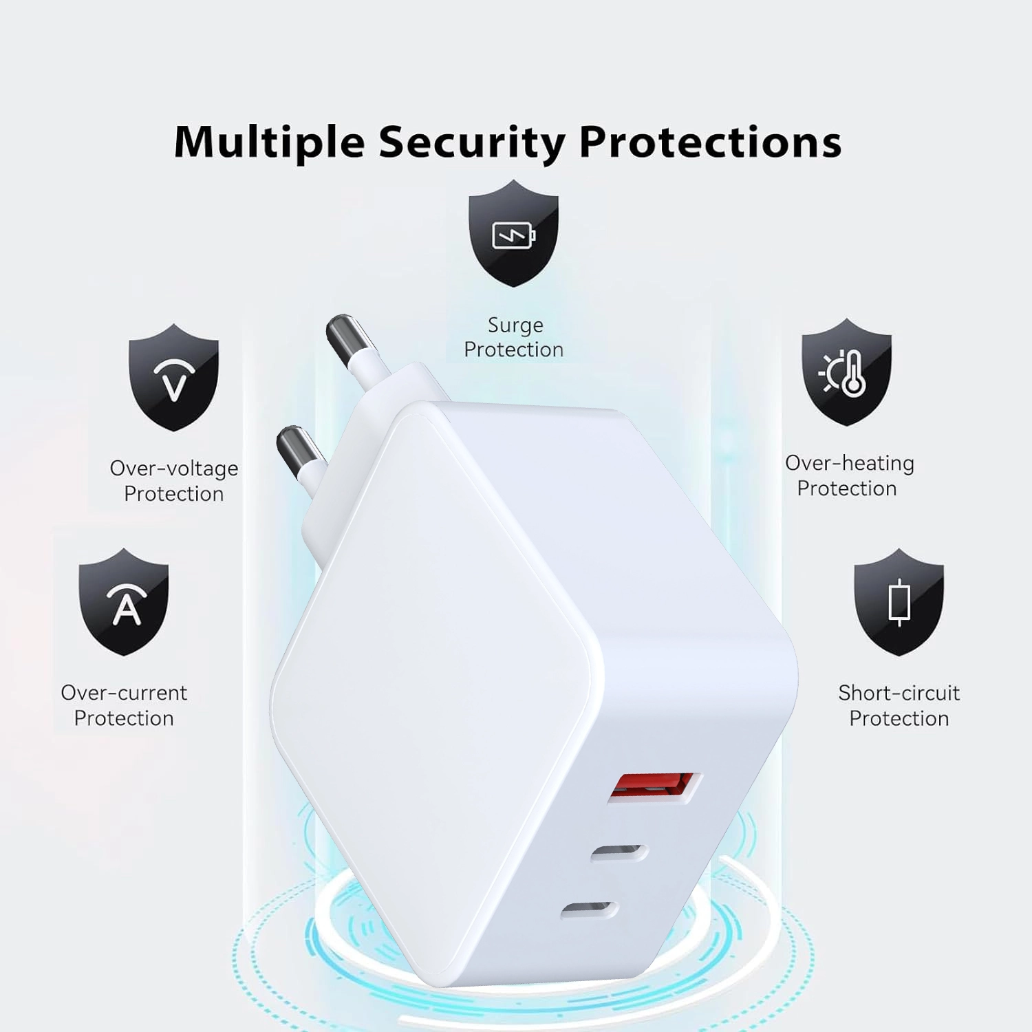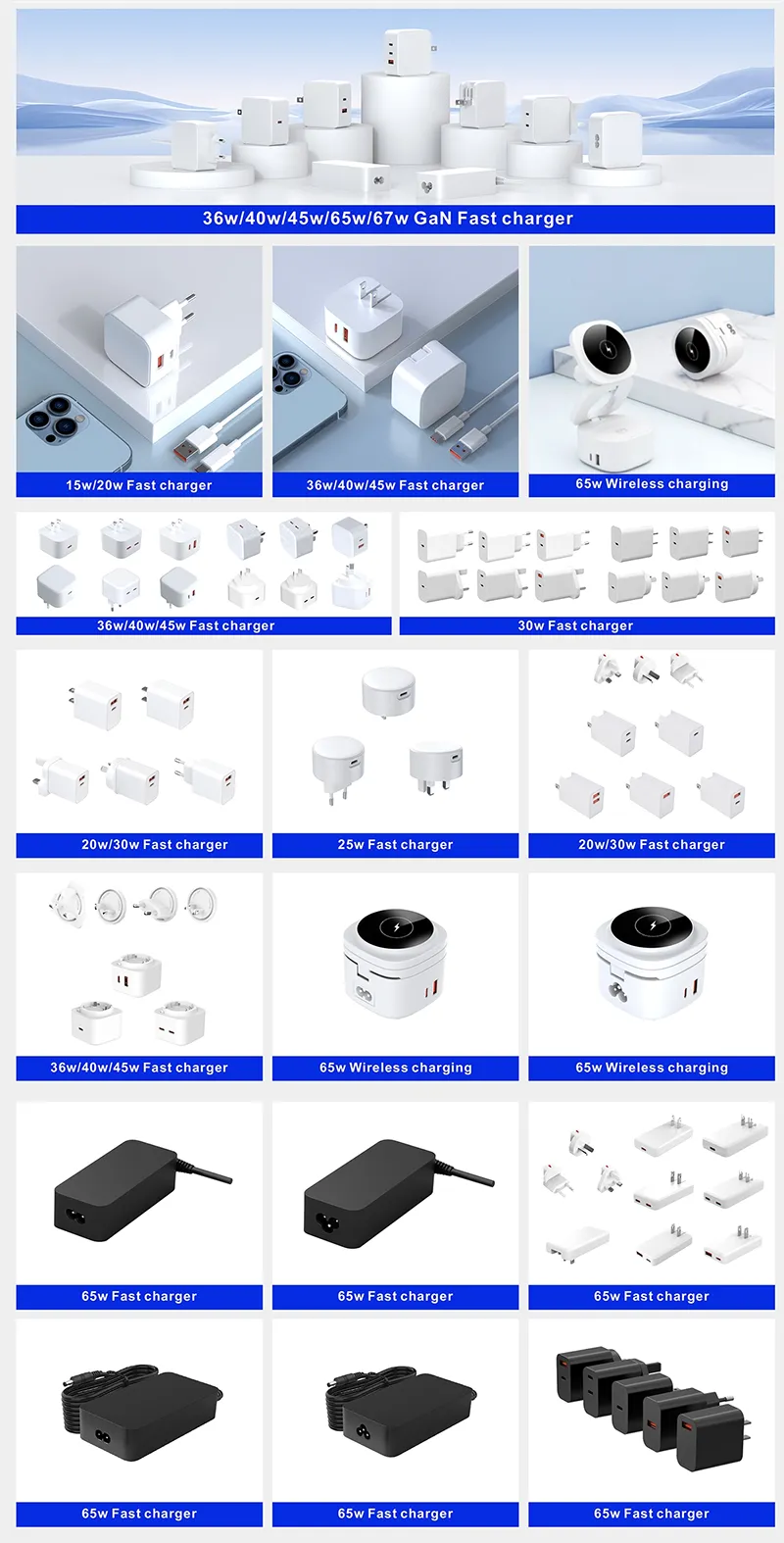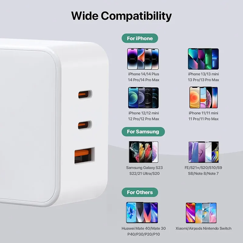 Pengecas ini menyampaikan sehingga 65W kuasa yang konsisten dan mengecas komputer riba dengan cekap (cth. MacBook Air/Pro, Dell XPS), tablet, telefon pintar (iPhone, Samsung Galaxy) dan peranti lain yang menyokong protokol PD. Reka bentuknya yang padat dan ringan menjadikannya sesuai untuk perjalanan, manakala perlindungan voltan lampau terbina dalam, arus lebihan dan litar pintas memastikan pengecasan yang selamat bagi pengecas dan peranti yang disambungkan. Ia biasanya dilengkapi dengan antara muka 1-2 USB-C, yang menyokong pengecasan berbilang peranti kecil pada masa yang sama, mengimbangi kuasa dan kemudahan.