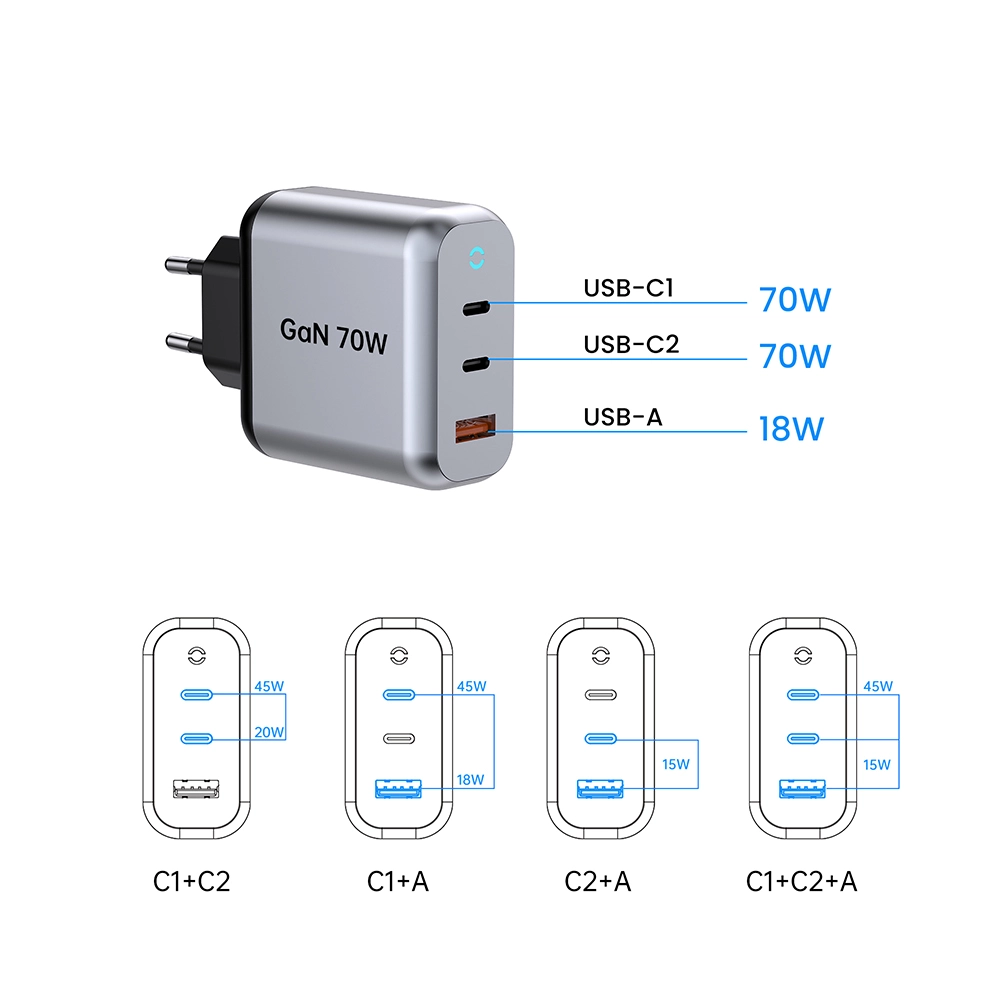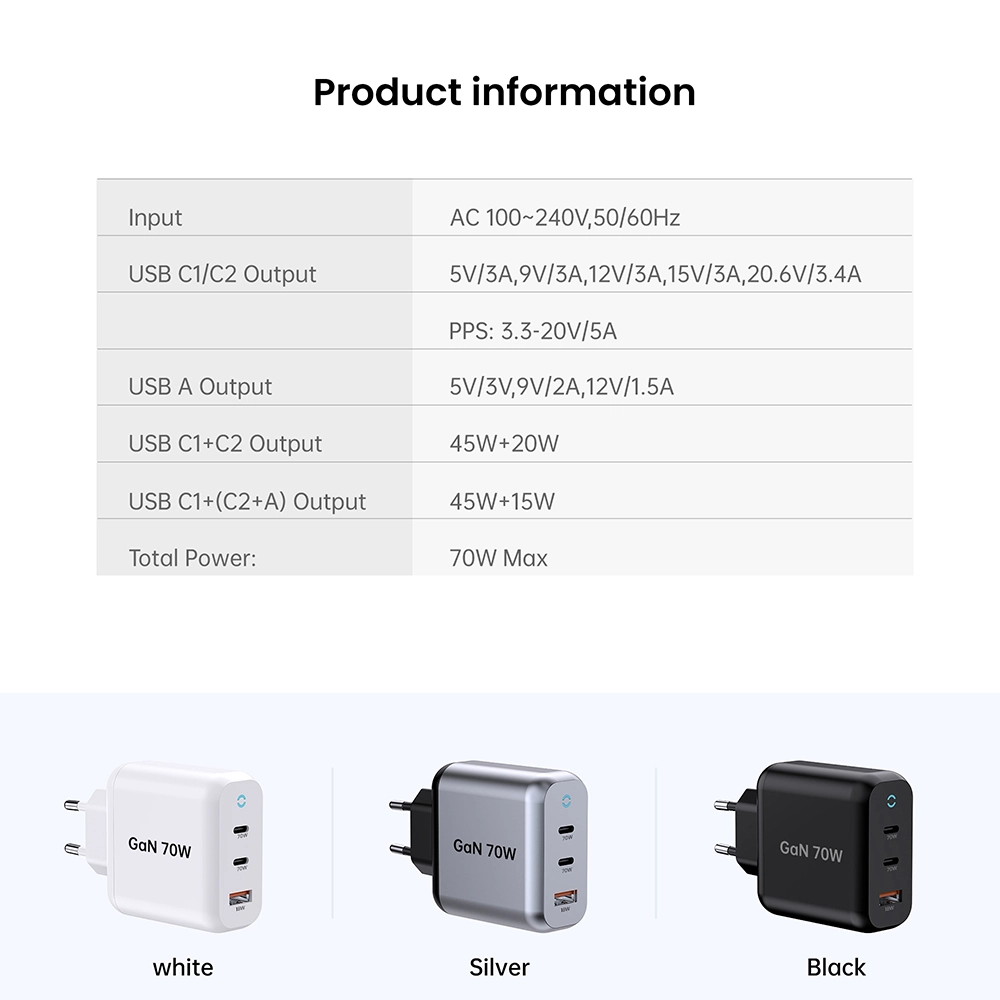 Output C1/C2: 5v3a, 9v3a, 12v3a, 15v3a, 20.6v3.4a (70w max) PPS: 3.3-11v 4.05a Output USB-A: 5v3a, 9v2a, 12v1.5a 3.3-11v 2a (22w max) C1+C2 Output: 45W+20W C1+C2+USB-A output: 45W+5V3A Jumlah: 70W |