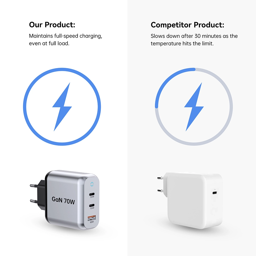Starwell Tahan Lama 70W PD Pengecas Pantas untuk Tablet Latpop Juga dipanggil 70W GAN Fast Charger: 2C1A, memenuhi keperluan harian untuk pengecasan cepat telefon bimbit dan peranti tablet. Saiz kecil, kuat dalam prestasi, dengan teknologi Gallium Nitride maju. Apabila digunakan dalam satu port, kuasa output maksimum antara muka USB-C1 ialah 70W. Apabila kedua-dua pelabuhan digunakan bersama-sama, USB-C1 masih mengekalkan 45W PD cepat pengecasan. Menyokong pelbagai protokol pengecasan cepat, termasuk PD3.0, PPS, QC4+, dan QC3.0, memastikan keserasian yang luas dengan pelbagai peranti