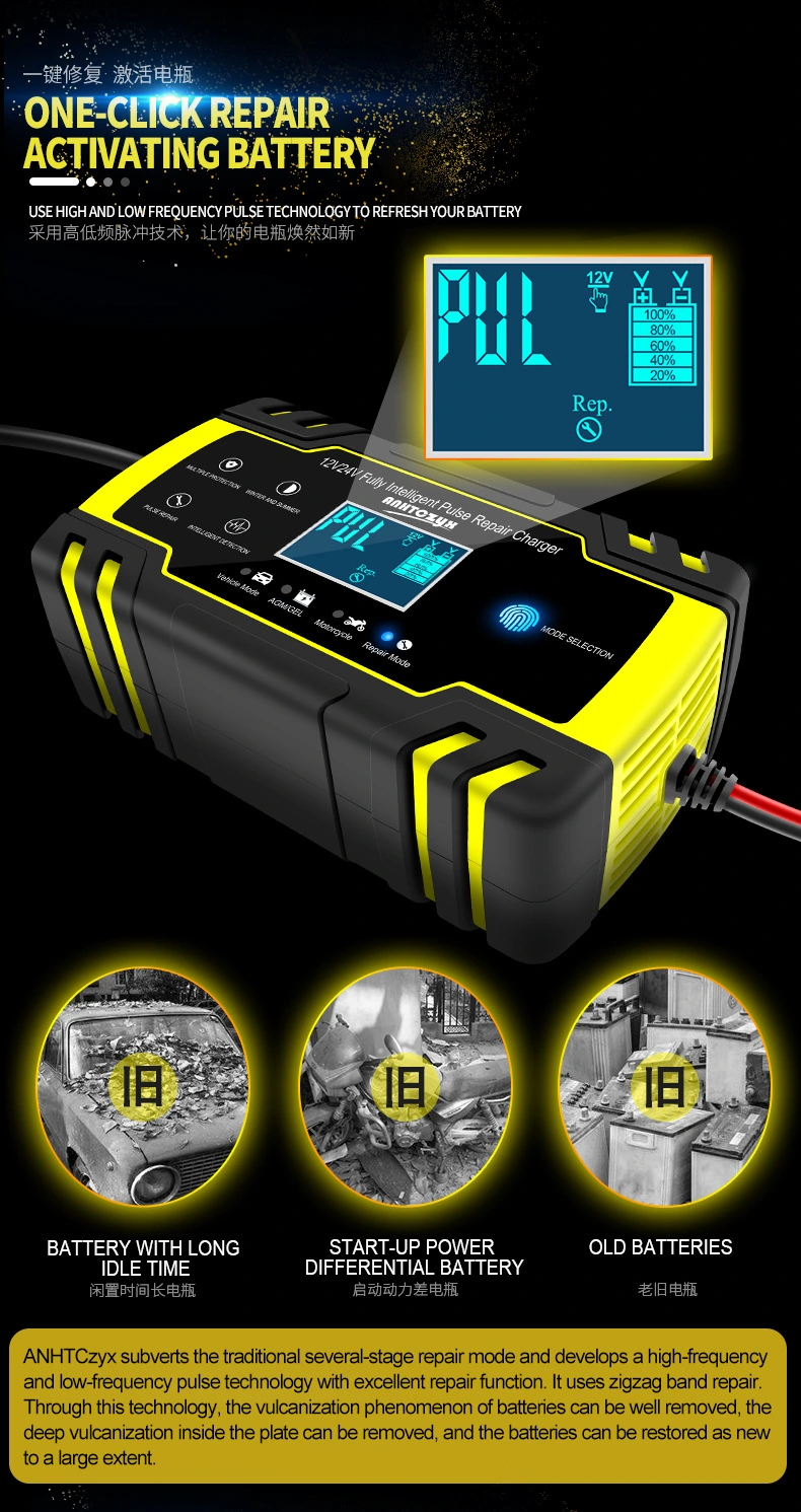 · Fungsi Pembaikan Nadi: Menggunakan teknologi nadi frekuensi tinggi untuk mengurangkan penghabluran sulfat plumbum (sulfasi), membantu memulihkan kapasiti yang hilang dalam bateri yang sudah tua atau kurang dicas.