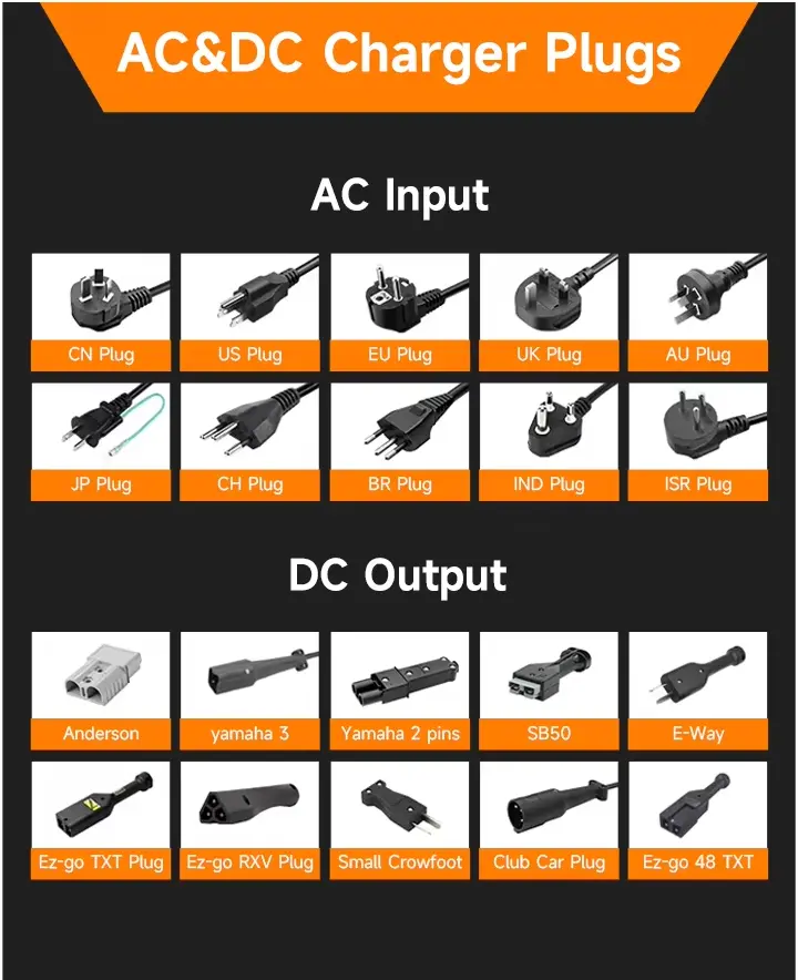· Serasi dengan penyambung DC standard termasuk Anderson, EZ-go, DS Club Car dan Yamaha.
