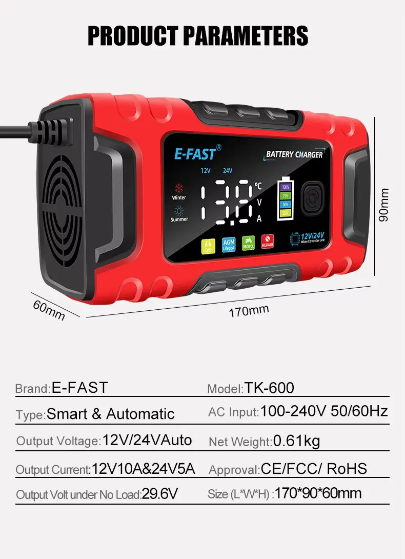 E-Fast TK-600 Berkualiti Tinggi automatik sepenuhnya dengan Teknologi Pembaikan Nadi 12V10A 24V5A asid plumbum lifepo4 pengecas bateri untuk kereta |