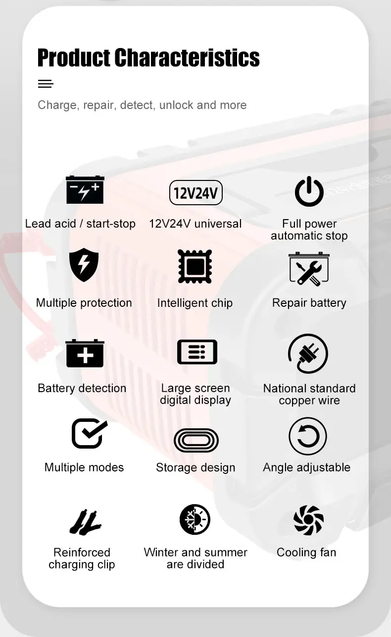 Pengecas Bateri Asid Plumbum 12V 24V Universal TK700 mengenal pasti voltan bateri (12V/24V) secara automatik, memastikan pengecasan yang betul tanpa risiko ketidakpadanan atau kerosakan.